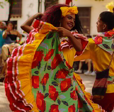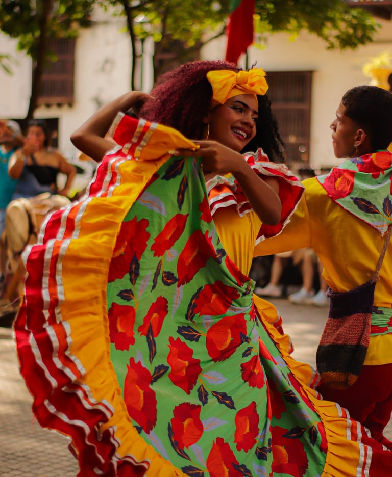 En Cartagena, cada calle es un escenario y cada paso un legado. La danza no es solo arte: es resistencia, herencia, fiesta. Esta imagen capta un instante de ese latido colectivo que habita los cuerpos que bailan cumbia, mapalé o champeta. Una mujer sonríe mientras su falda vuela como el alma del Caribe: libre, colorida, poderosa. Bailar aquí es un acto de memoria y alegría que conecta el pasado con el presente.